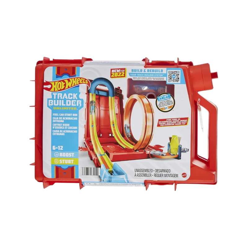 Unleash endless stunts with the Hot Wheels Track Builder Unlimited Fuel Can Stunt Box. This compact set includes 14 track-building components and a 1:64 scale vehicle. Designed for imaginative play, it offers customizable setups in a portable fuel-can-shaped case.