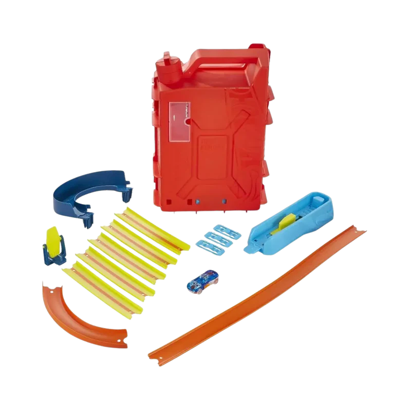 Open the fuel can-style case to reveal 14 track components and one Hot Wheels car. Use the pieces to build customized stunts including ramps, jumps, and launcher setups. The portable design allows kids to play anywhere and store everything easily afterward. All pieces are designed to fit seamlessly with other Hot Wheels Track Builder Unlimited sets, giving kids the power to expand their stunt universe with each use.